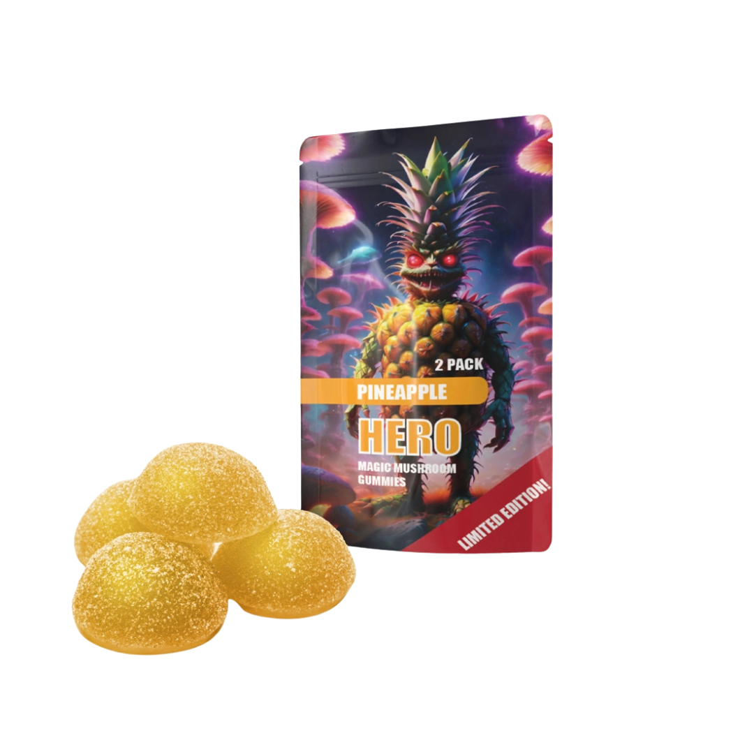 Hero Muscimol Gummies Pineapple 10mg. Den exotiska smaken av saftig ananas ger en uppfriskande och söt upplevelse som direkt för tankarna till soliga paradisöar. I kombination med muscimol skapas en unik balans mellan energi och avslappning – en perfekt blandning för både kropp och sinne.